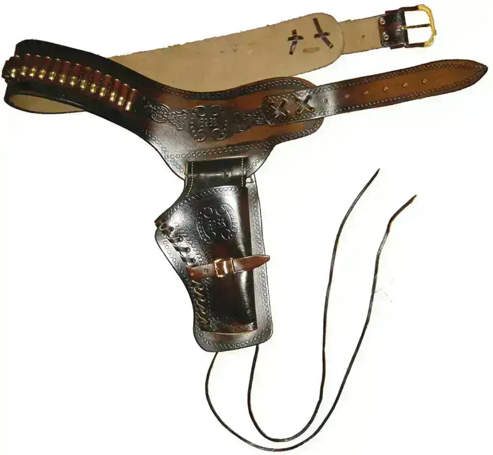 OBS: Dette er lær, hvert belte vil ha sitt unike personlige preg og bildene kan avvike noe. Revolvere og patroner medfølger ikke!