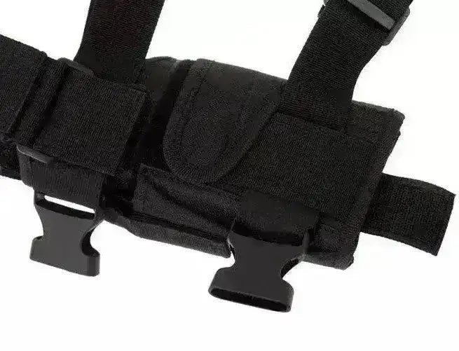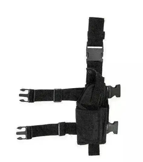 Dette universale pistolhylsteret er laget av nylon og har en matt svart farge. Det festes i beltet og to justerbare stropper rundt låret. Hylsteret sitter godt og kan tilpasses en rekke pistoler da størrelsen justeres med borrelås, blant annet passer hylsteret til M9, Glock, 1911, USP og mye mer!