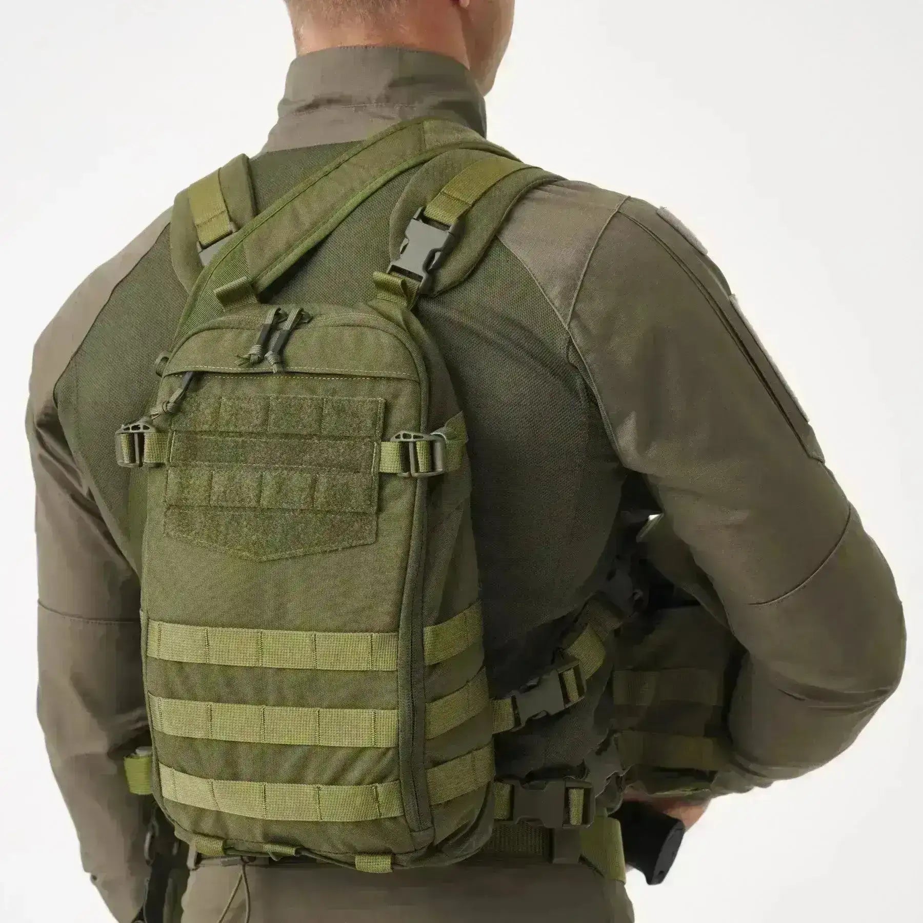 Stroppene er justerbare og kan enkelt tas av i sin helhet. Sekken kan monteres rett på stridsvesten med MOLLE/PALS.