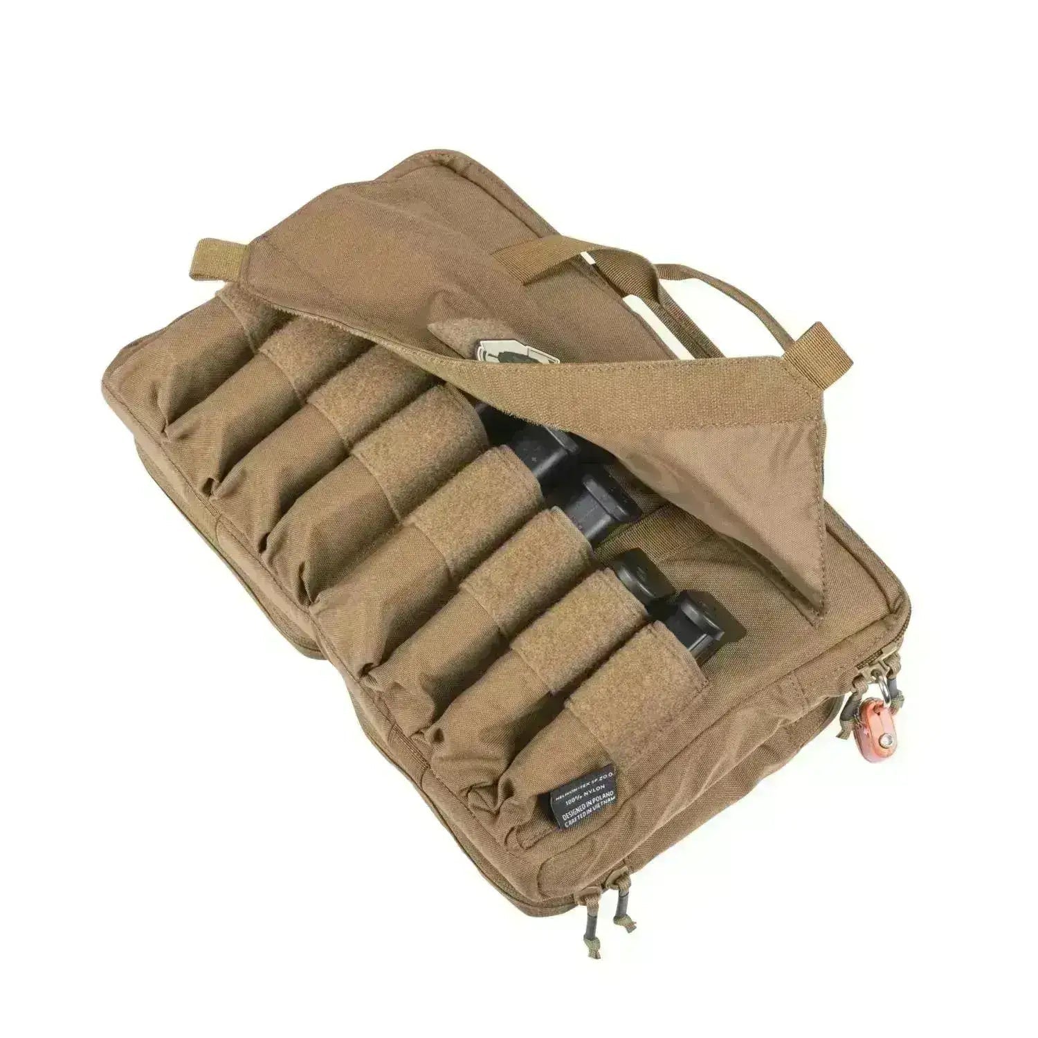 På utsiden er det to glidelåslommer på den ene siden – en til utstyr og en til rengjøringsutstyr med en ekstra "skitten" seksjon. På den andre siden er det åtte lommer for magasiner som lukkes med en enkel borrelåsflik. Vesken er utstyrt med komfortable bærehåndtak.