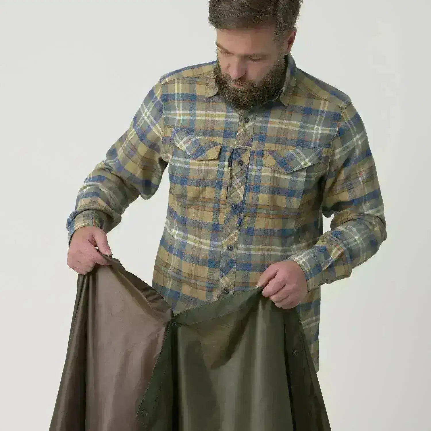 Helikon‑Tex US Model Poncho er en robust og lett regnponcho i rip-stop polyester, utviklet med fokus på funksjonalitet for friluft og taktiske situasjoner. Materialet er vanntett og hurtigtørkende, med limte sømmer og reflekterende trykknapper og metallmaljer for ekstra slitestyrke.