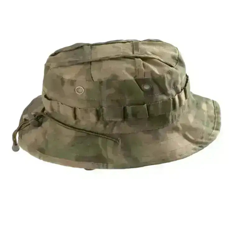 Slitesterk jungelhatt/patruljehatt med Everglade kamuflasje. Hatten er perfekt til tur, jakt, fiske og fritid. Hatten er laget av en polycotton blanding bestående av 65% bomull. Ventileringshull sørger for at svette og fukt transporteres vekk fra hodet og hatten har festemuligheter for vegetasjon dersom du skulle trenge å kamuflere deg ekstra godt, for eksempel i airsoftspill.