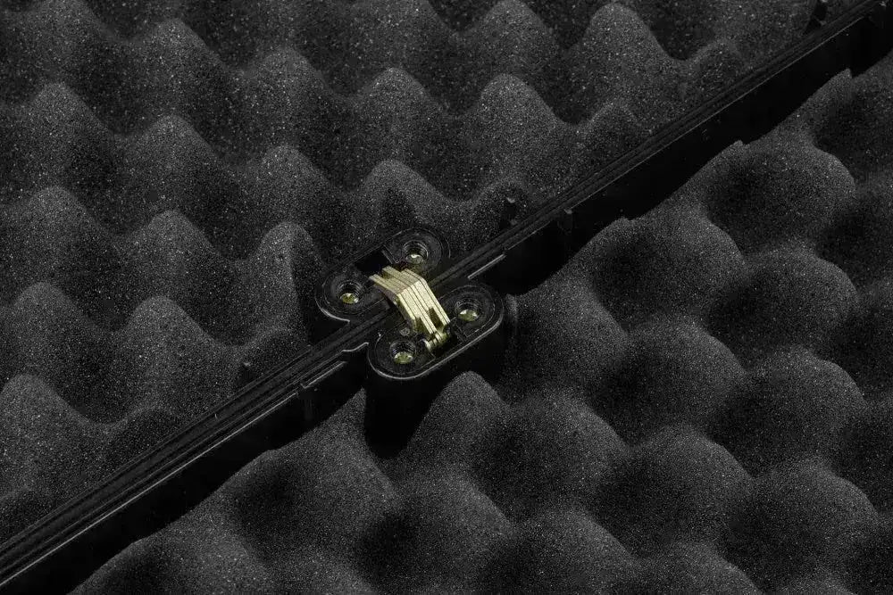 Kofferten er utstyrt med med kraftige ledd og godt skuminnlegg.