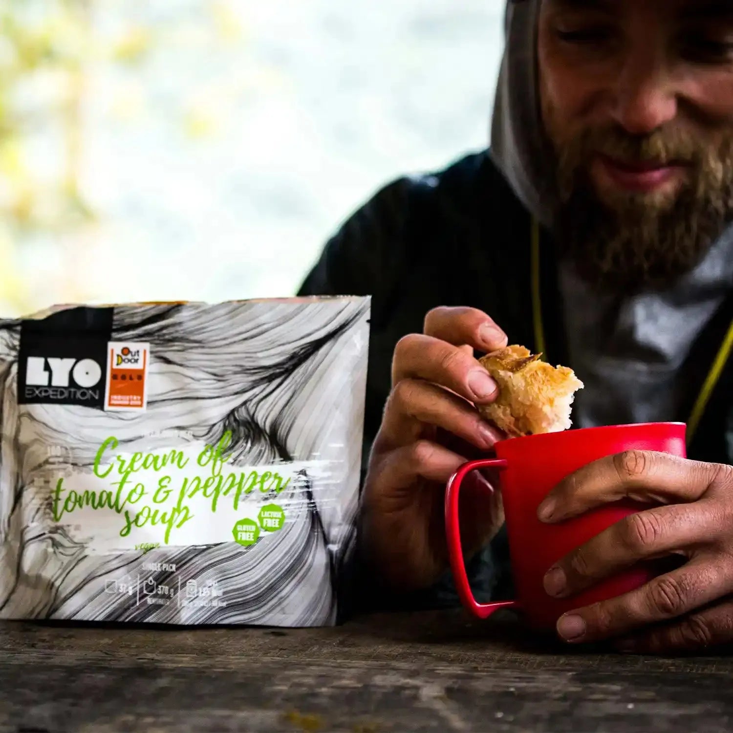LYOFOOD Creamy Tomato & Pepper Soup kombinerer moden tomat og rød paprika i en kremet og varmende suppe. Laget med 100 % naturlige ingredienser, helt uten gluten og kunstige tilsetningsstoffer. Perfekt som lett middag, mellommåltid eller forrett på fjelltur, camping eller ekspedisjoner der rask energi og god smak er viktig.