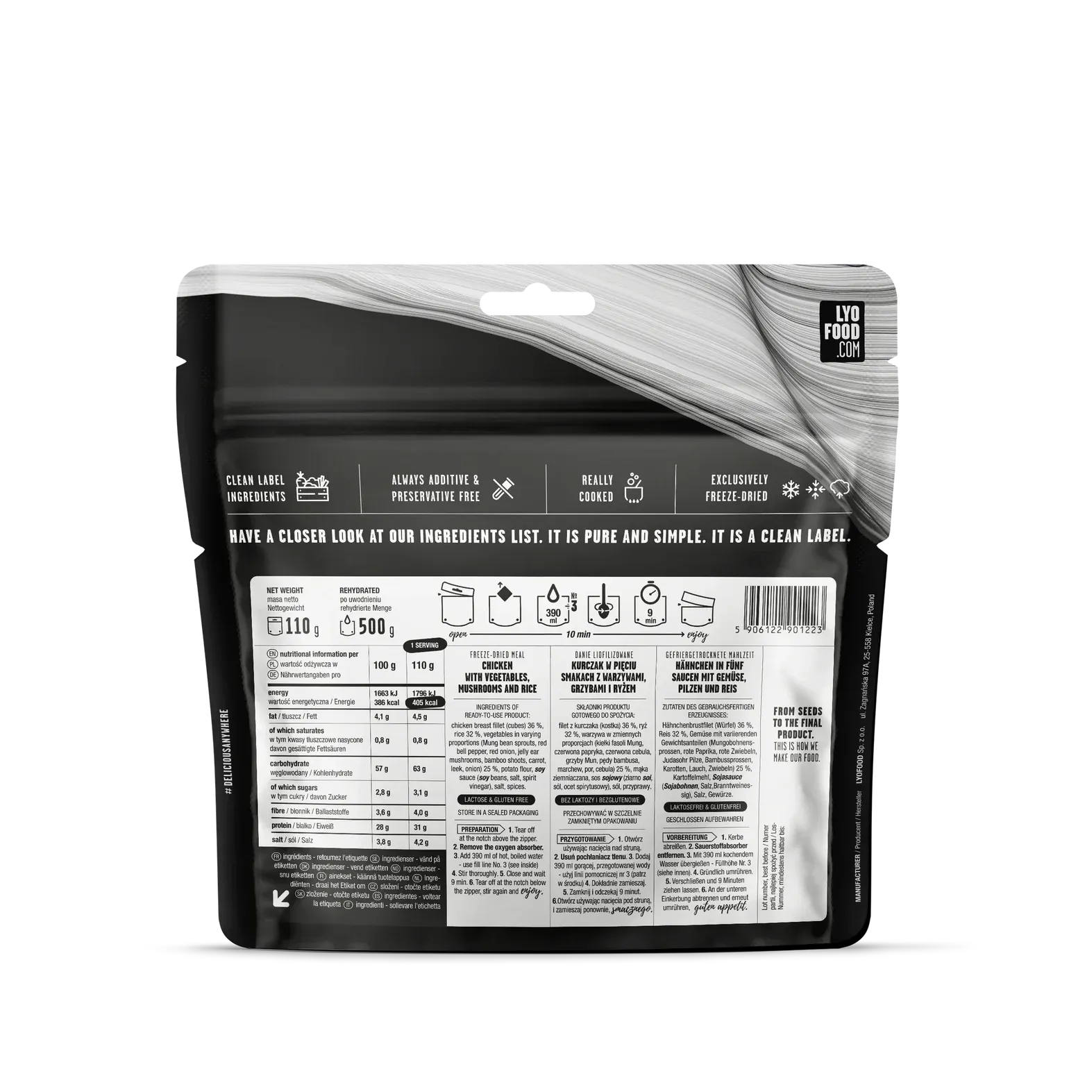 LYOFOOD Kyllinggryte med ris gir deg en balansert og næringsrik middag laget av møre kyllingbiter, ris og grønnsaker. Retten er laget med 100 % naturlige ingredienser, fri for konserveringsmidler og laktose, og er frysetørket for lav vekt og lang holdbarhet. Perfekt for tur, jakt og ekspedisjoner hvor energi og enkel tilberedning er viktig.
