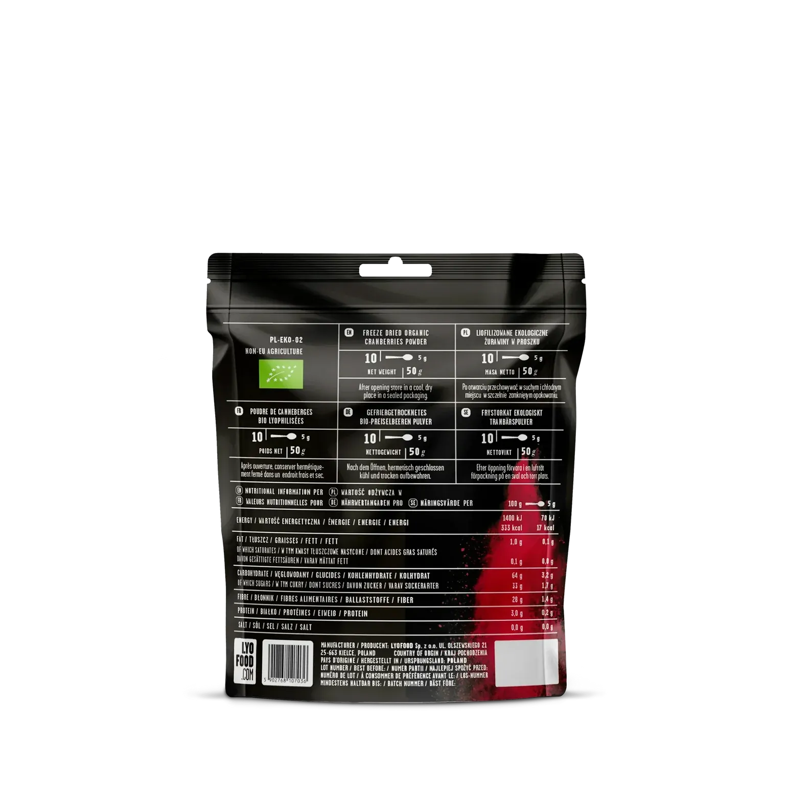 LYOFOOD Cranberry Powder gir deg tranebær i sin reneste form, skånsomt tørket og malt til pulver. Perfekt for å styrke smoothies, grøt, yoghurt eller energibarer med en naturlig kilde til antioksidanter og vitamin C. Laget av økologiske tranebær – 100 % naturlig, ingen tilsetningsstoffer.