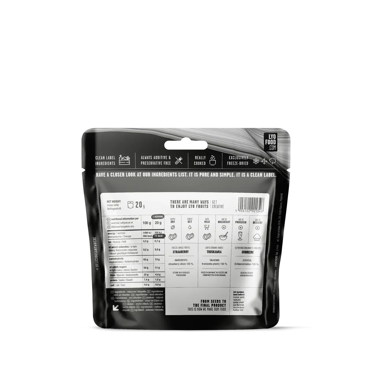 Disse frysetørkede jordbærene fra LYOFOOD er laget av 100 % friske jordbær, uten tilsatt sukker, konserveringsmidler eller tilsetningsstoffer. Nyt dem som snacks, bland i frokost, smoothie, dessert – eller gjør turvinen mer festlig. Perfekt for friluftsliv, baking og som en naturlig snack.
