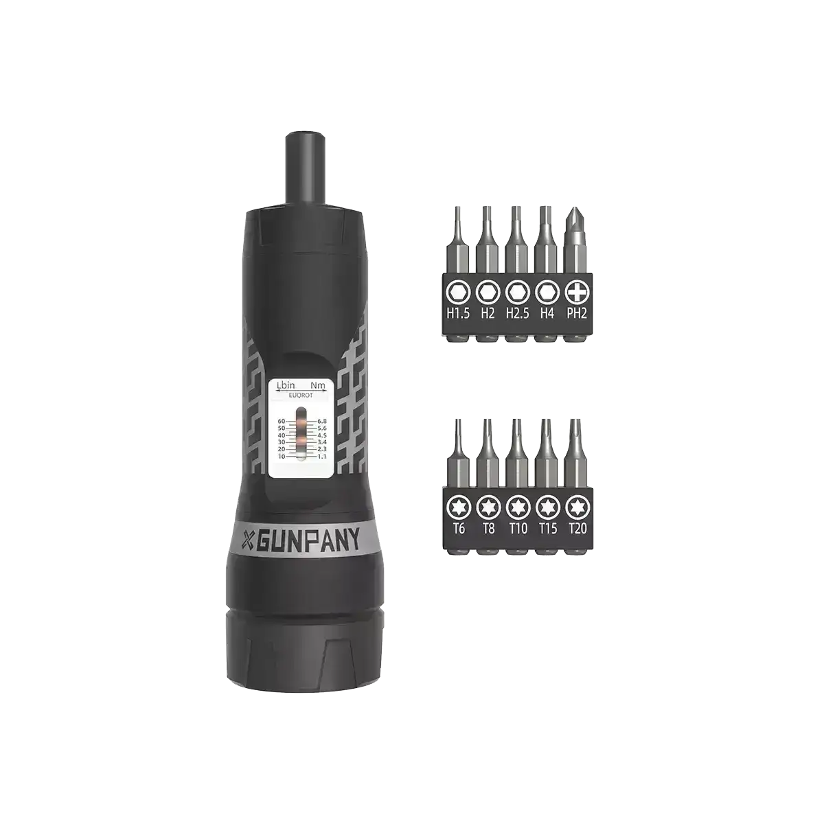 Momentnøkkel skrutrekker fra Gunpany med justerbare innstillinger (10-60 in/lbs & 1,1-6,8 Nm). Perfekt for presis montering av kikkertsikter og annet utstyr. Leveres med 10 ulike bits i stål for ulike behov. Gummiert håndtak for bedre grep og komfort.
