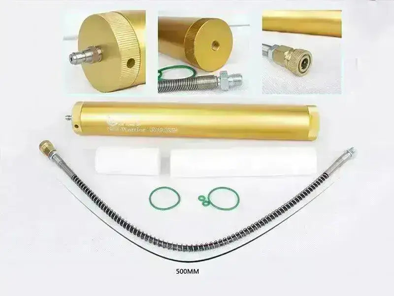 Filteret kommer med diverse pakninger samt en 500mm lang fylleslange med hun-QD hurtigkobling (standard 8mm). Selve filteret har han-QD hurtigkobling.