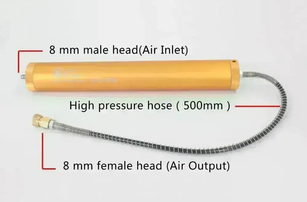 Filteret kan kobles mellom fyllestasjonen din (for eksempel en dykkertank eller håndpumpe) og luftvåpenet.