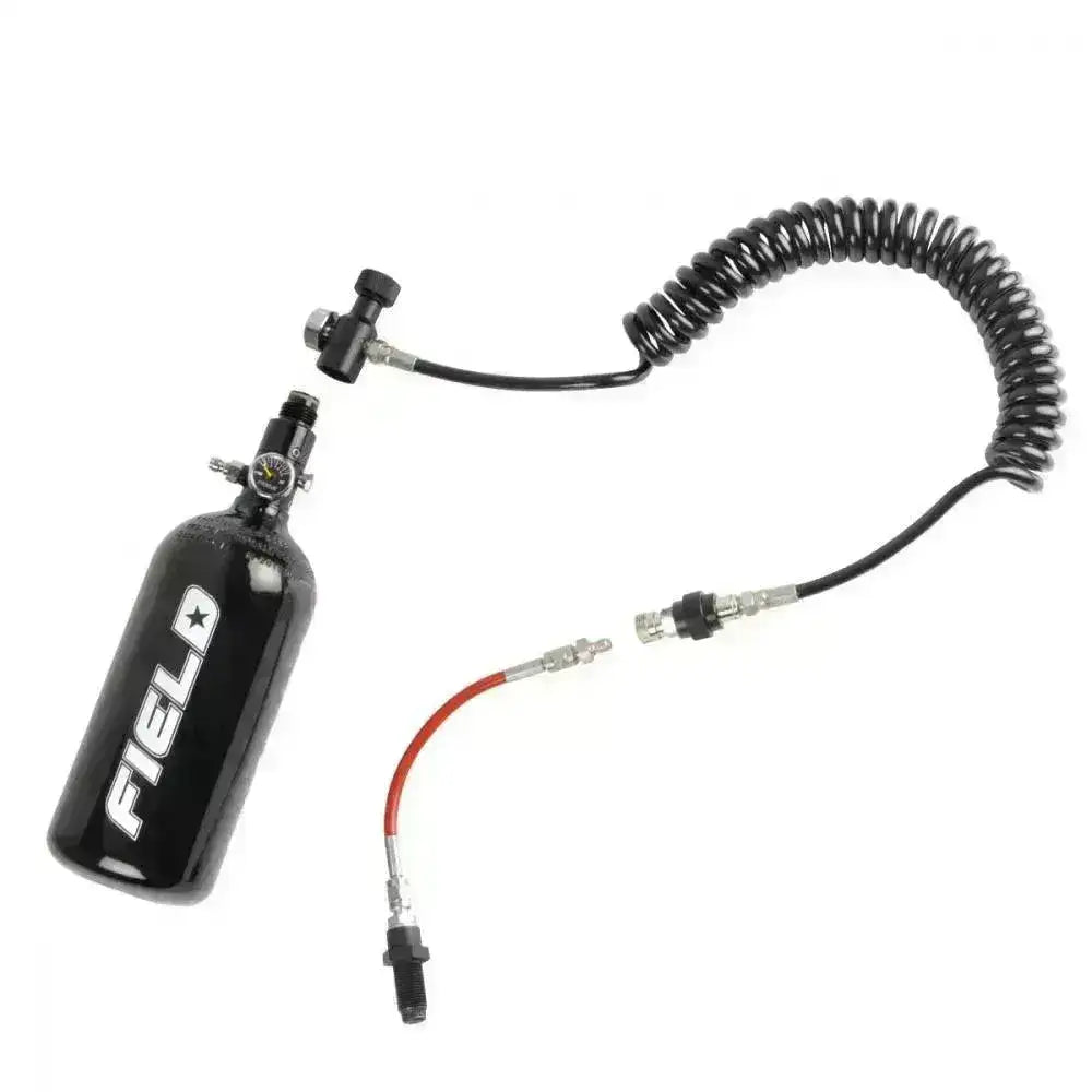 Slange og remoteline er for seg selv og kobles sammen, dette gjør at du slipper å demontere kolben for hver gang, alt du trenger å gjøre er å enkelt klikke remote line (Den svarte slangen på bildet) fra den den røde slangen på bildet, så er rifla kblet fra tanken - Enklere blir det ikke!