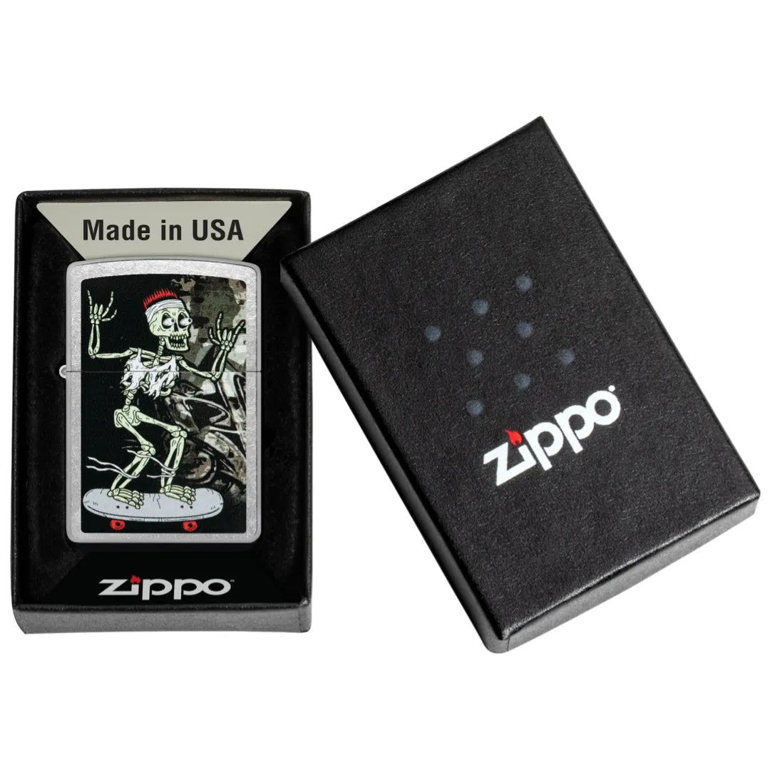 En ikonisk Zippo-lighter med en tøff "Skating Skeleton"-design trykket på en klassisk Street Chrome-overflate. Perfekt for skate-entusiaster og samlere. Zippo-lighteren leveres i en gaveeske og fungerer optimalt med Zippo bensin.
