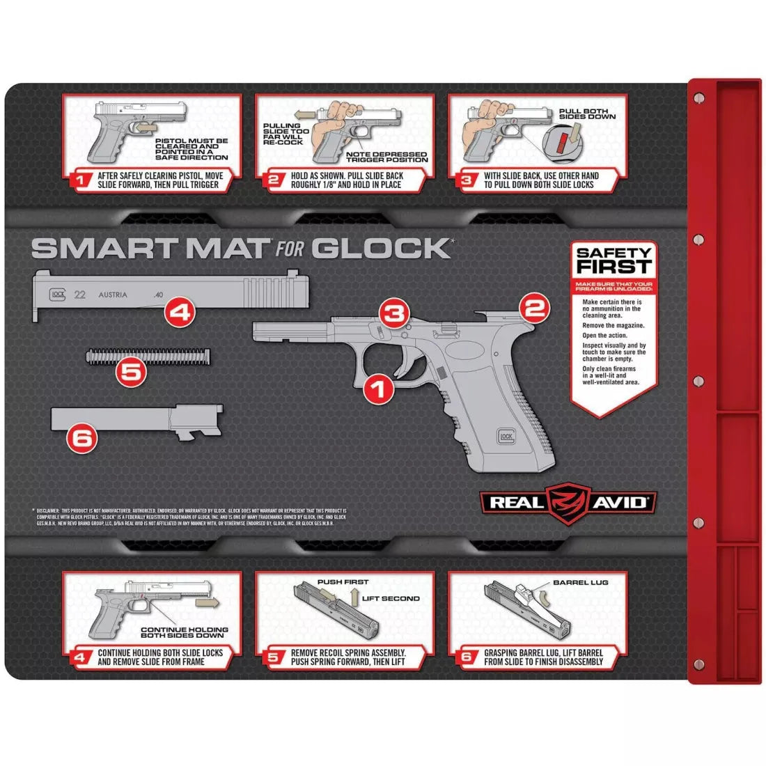 Real Avid Smart Mat for Glock er en spesialdesignet våpenmatte laget for demontering og rengjøring av Glock-pistoler. Med en overflate på 48x41cm gir denne matten god plass til å arbeide med pistolen mens integrert trinn-for-trinn demonteringsguide gir en enkel og trygg prosess for brukeren.