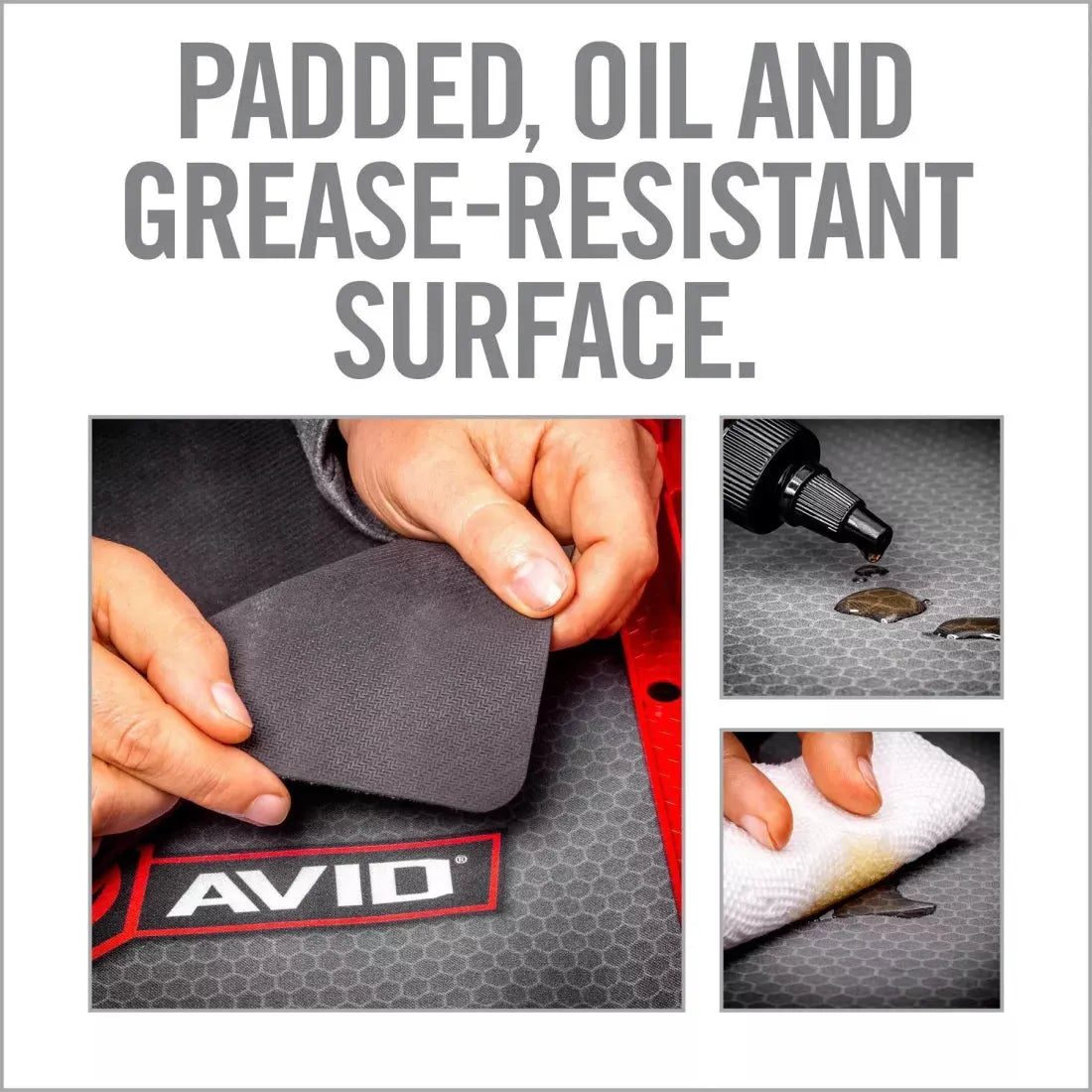 Matten har en innebygd magnetisk deleskål og en fastmontert oppbevaringsseksjon som holder smådeler som stifter, skruer og fjærer trygt på plass. Den olje- og løsemiddelresistente overflaten beskytter arbeidsområdet, mens den sklisikre baksiden sikrer at matten holder seg på plass under bruk.