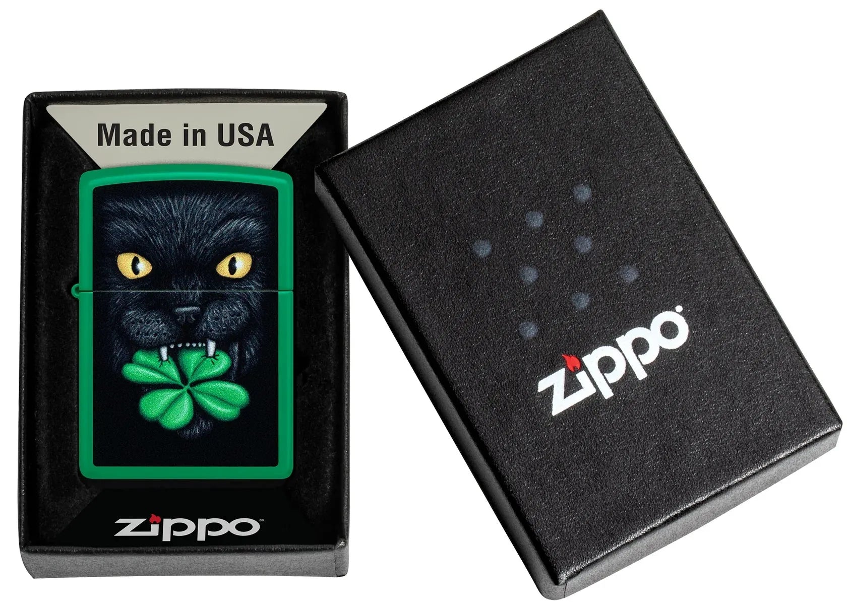 Legg til et snev av flaks i hverdagen med Zippo Feline Lucky Design. Denne klassiske Zippo-lighteren har en livlig grønn matt finish og et fargerikt motiv av en svart katt som holder en firkløver i munnen – et symbol på hell og beskyttelse mot uflaks.