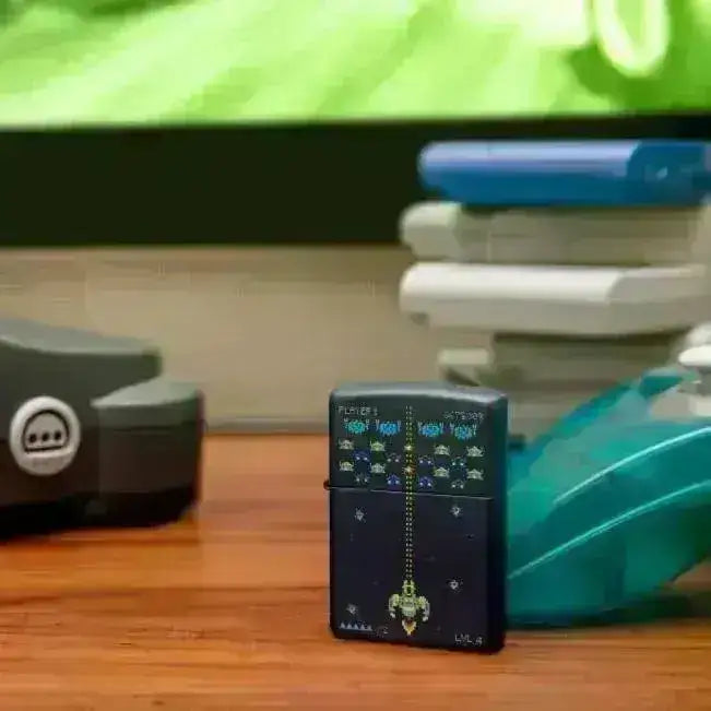 Retro gaming Zippo for gamere og alle som elsker retro ting - Matt marine bakgrunn med pixel game print