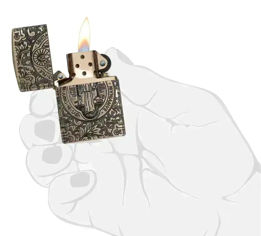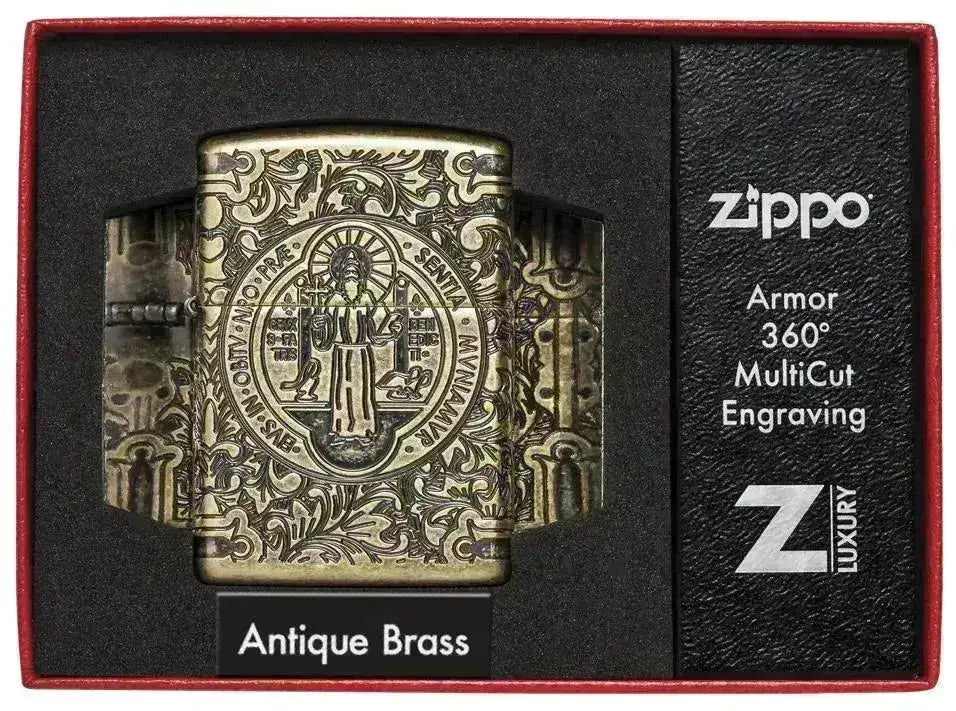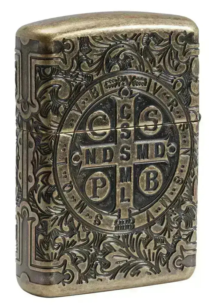 Limited edition! Medaljen og korset til St. Benedict omgitt av rullende blomster som omslutter hele overflaten av lighteren ved hjelp av Zippos 360 graders multicut graveringsprosess på en armor antikk messing finish lighter!