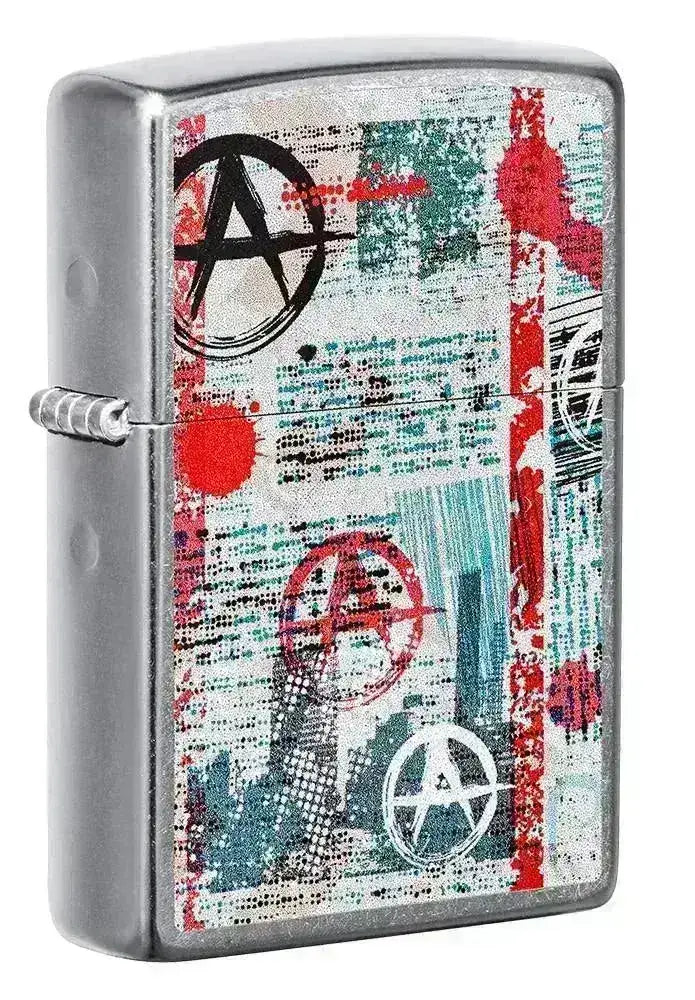 Gatekunst motiv med anarkisymbolikk. Fargerik lighter som er flott å ha med seg på tur!
