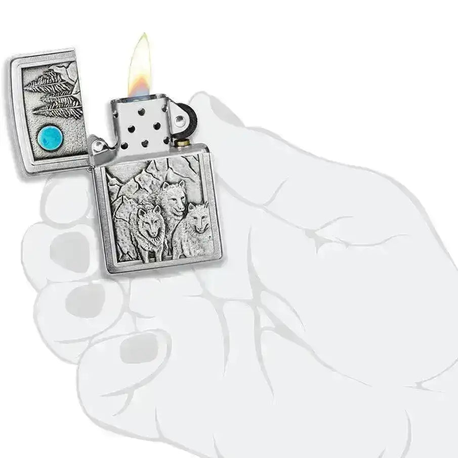Original Zippo med flott ulvemotiv og krystallblå måne