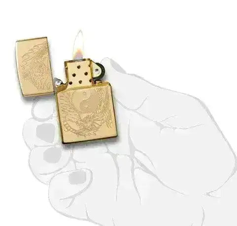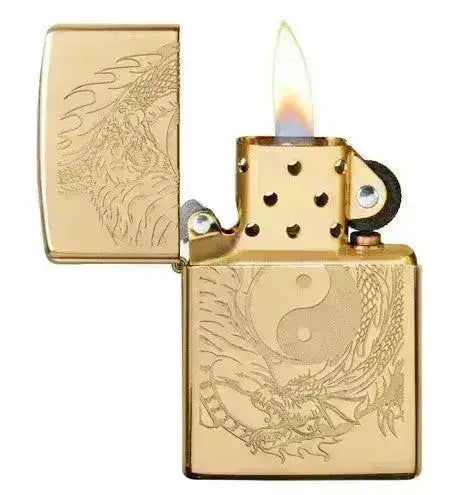 Original, vindsikker Zippo lighter med skinnende blank overflate og flott detaljert inngravering av en drage og tideg som kveiler rundt Yin og Yang symbolet.
